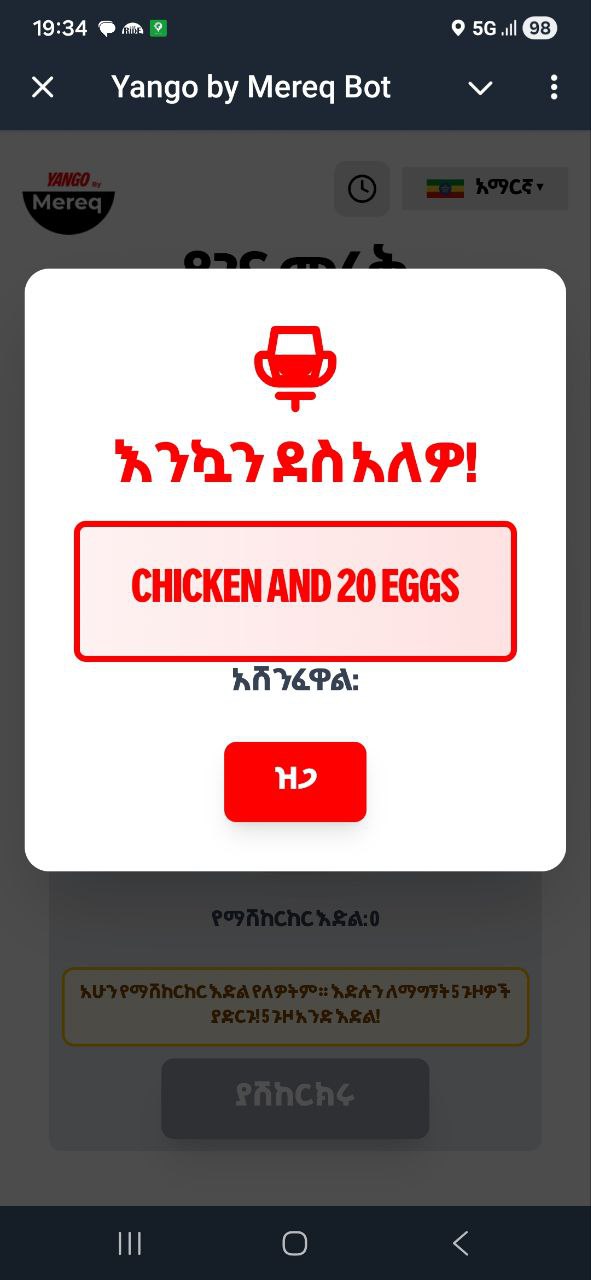 The Yango Genna Campaign is a driver engagement platform that rewards drivers based on their completed trips. Drivers earn chances to spin a virtual prize wheel to win goats, chickens with eggs, and cash prizes. The platform integrates with a Telegram bot to streamline participation and notifications.